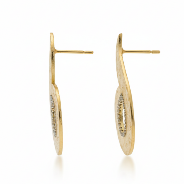 At the center, a delicate teardrop outline of shimmering stones enhances the design with subtle brilliance, creating a refined focal point without overwhelming the piece. The contrast between the matte texture and the polished sparkle gives these earrings a balanced, sophisticated character.