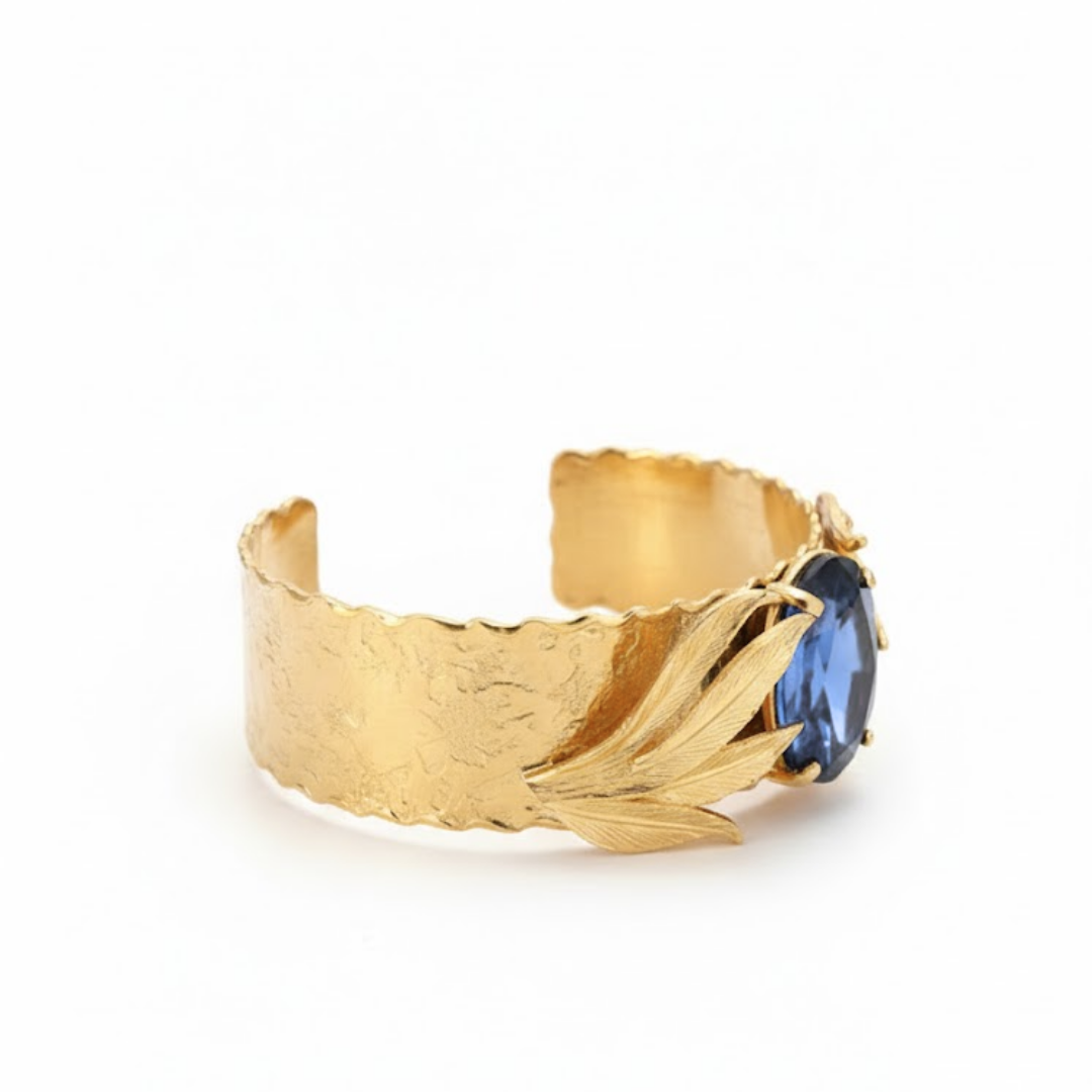 Available with vibrant gemstone tones—warm amber orange or deep sapphire blue—this piece brings a rich contrast against the matte gold texture. The result is a statement bracelet that feels both natural and luxurious.