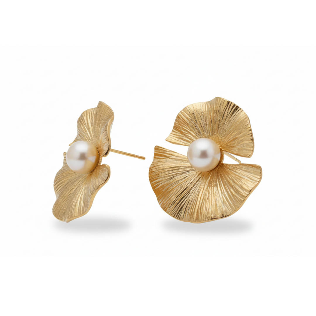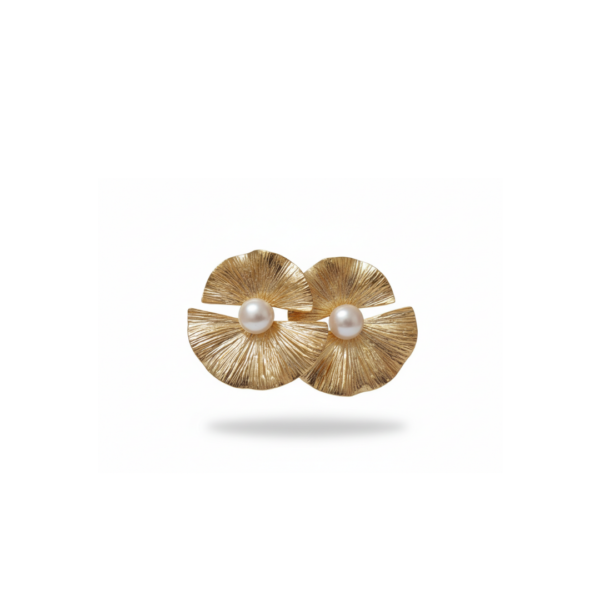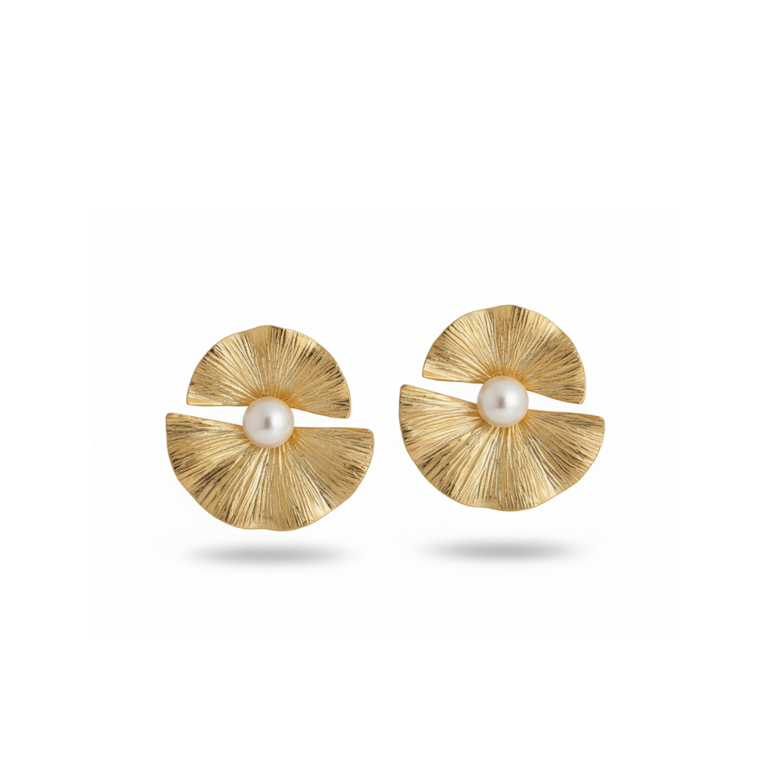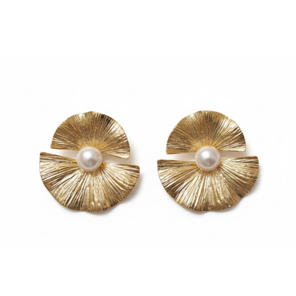 A refined pair of earrings designed with a structured fan silhouette and a central pearl accent. The textured gold surface radiates outward, creating a subtle sunburst effect that adds depth and elegance without excess.