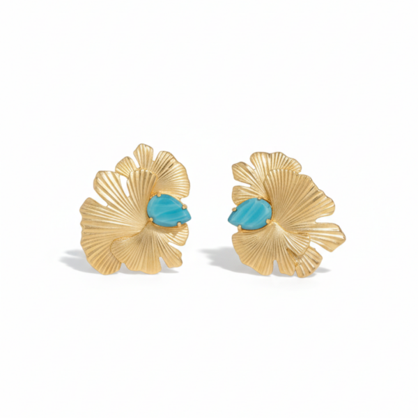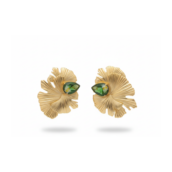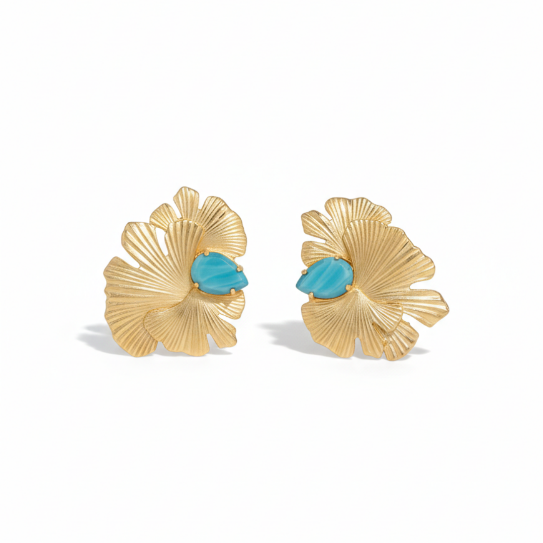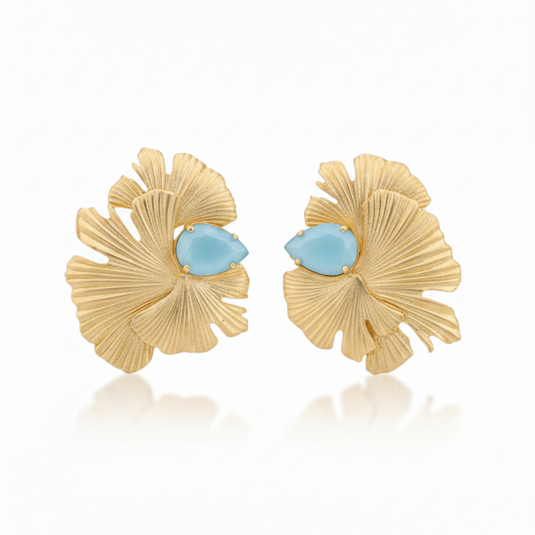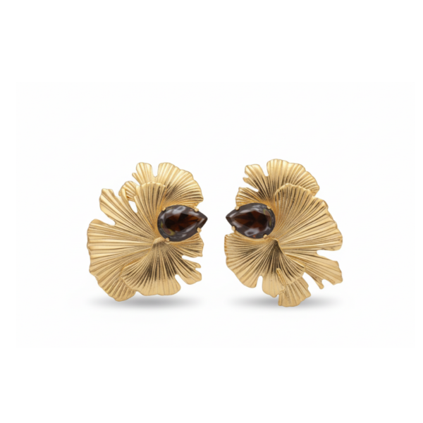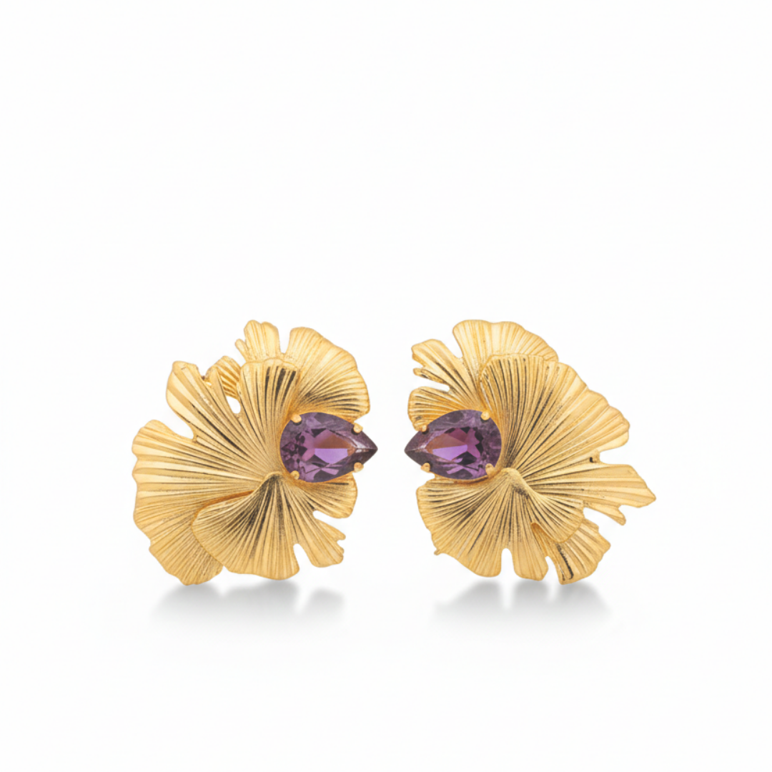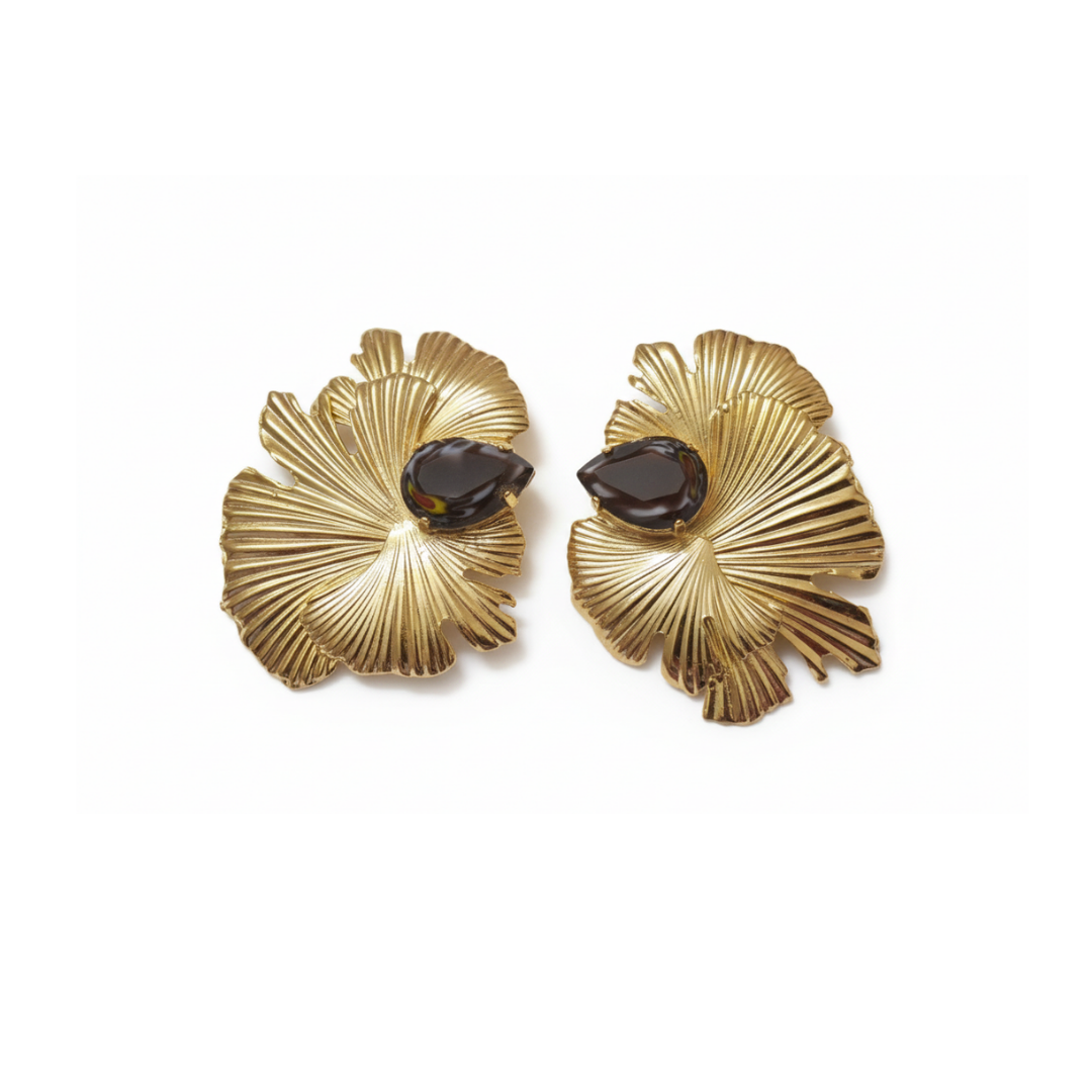 A bold pair of statement earrings inspired by layered floral forms. The sculpted gold design features flowing, fan-like textures that create depth, movement, and a strong visual presence.