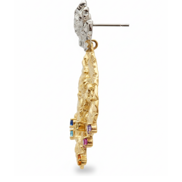 A bold artistic statement, these drop earrings combine raw texture with refined contrast. The upper stud features a sculpted silver-toned form, giving an organic, almost molten appearance that immediately draws attention.