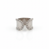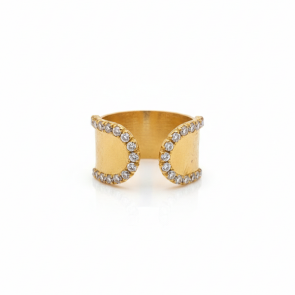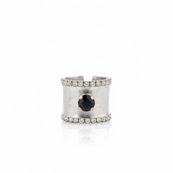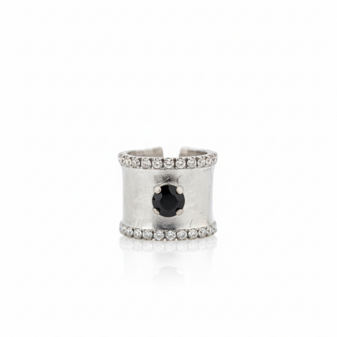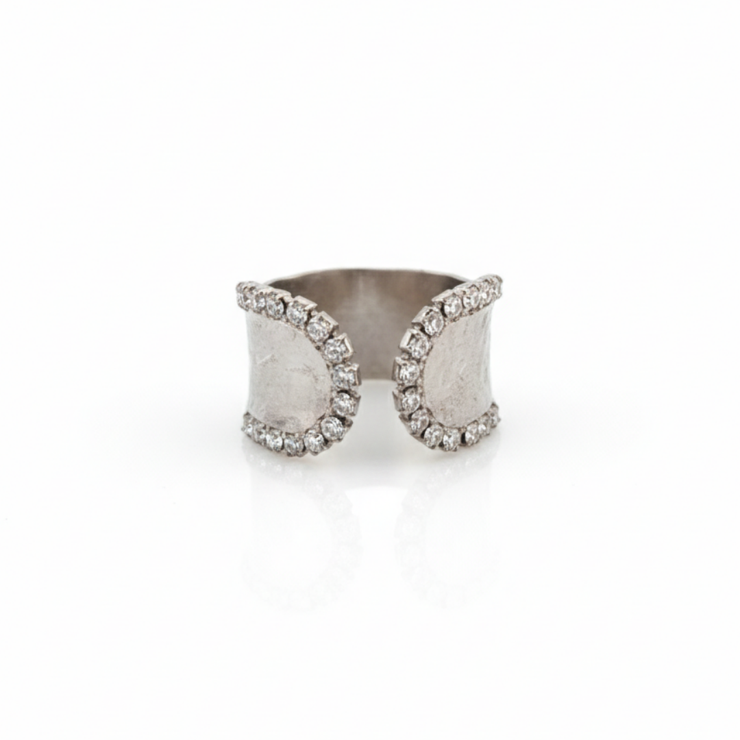 A bold statement ring designed to stand out, featuring a wide band structure enhanced with shimmering crystal borders and a striking central stone. The balanced composition between the textured metal surface and the brilliance of the crystals creates a luxurious yet modern aesthetic.